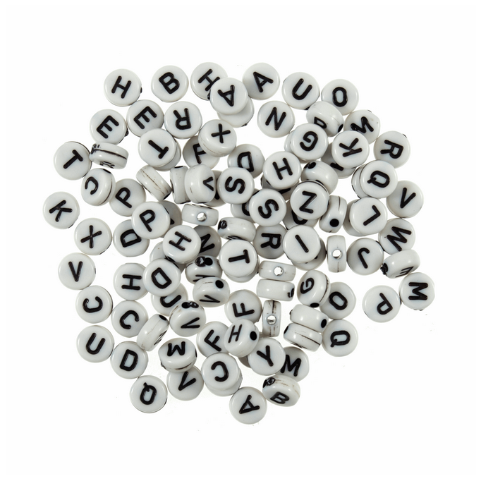 100 x plastic alphabet beads - black letters on a white cube - perfect for children's jewellery making and also for hot glue gunning a special message onto something you're making (i.e. anything that needs pimping.) Also good for card making etc. too :-) x
