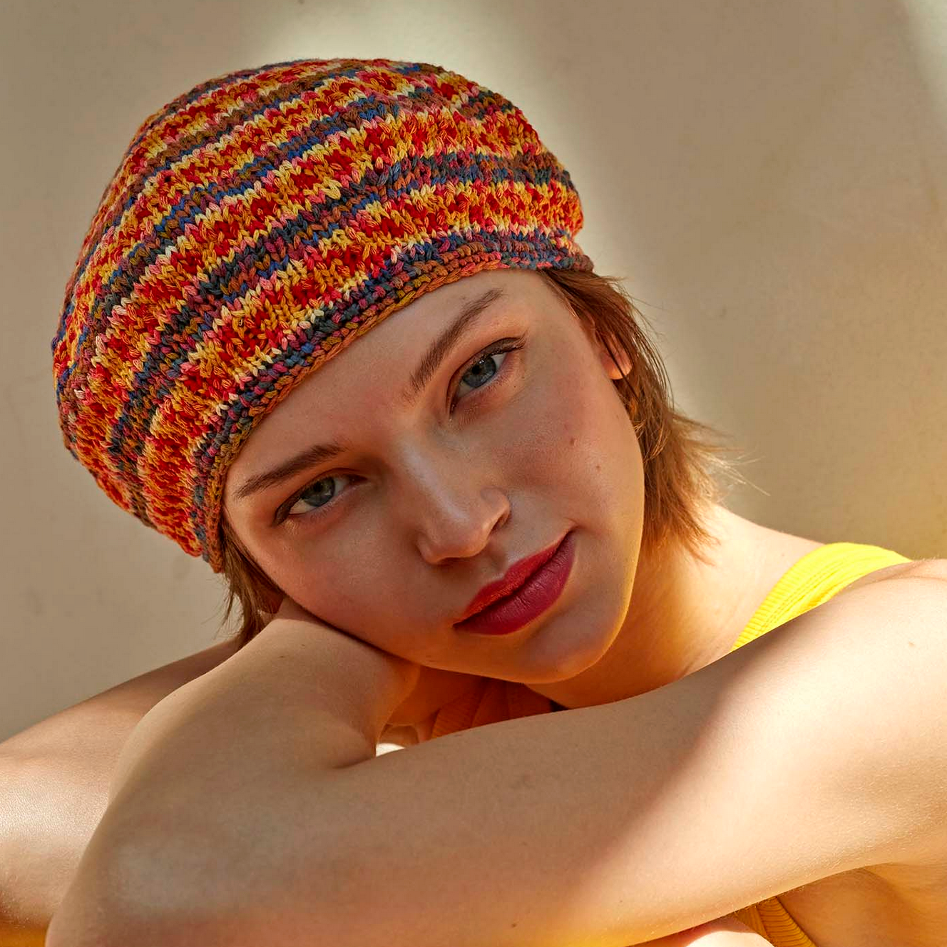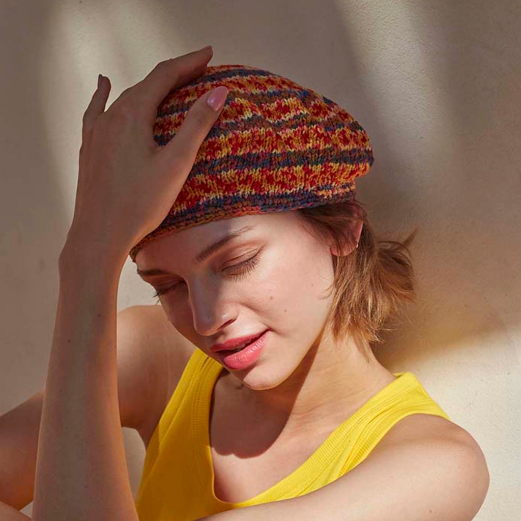 Let your inner artistic genius out and start creating this wonderful beret style hat knitting pattern, with this fabulously painterly new ARTSY yarn! This is the knitted version of this lovely hat. (There is a crochet version too called "Flow with it"!) The knitted version gives a fun stripe effect.