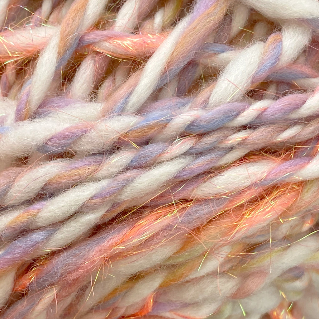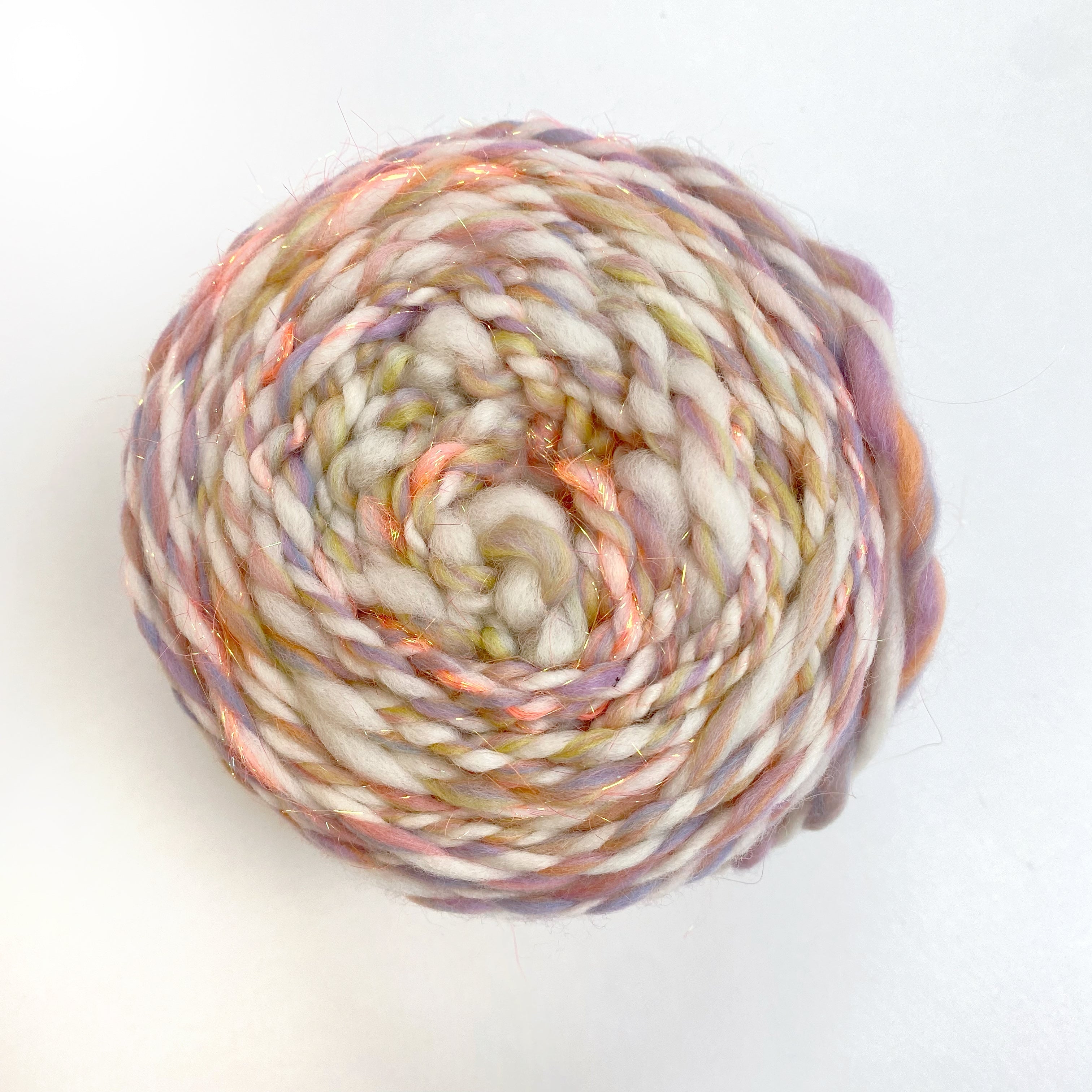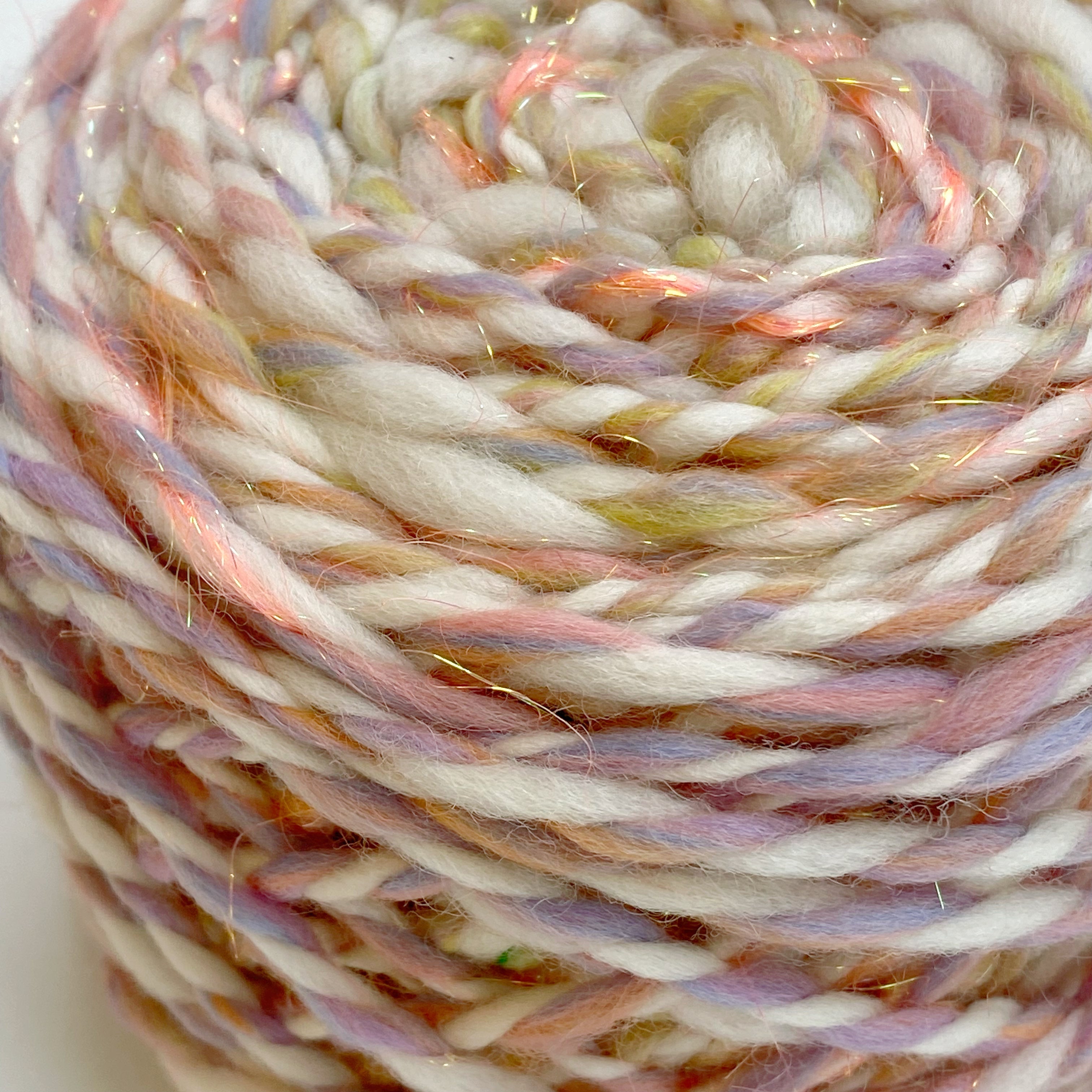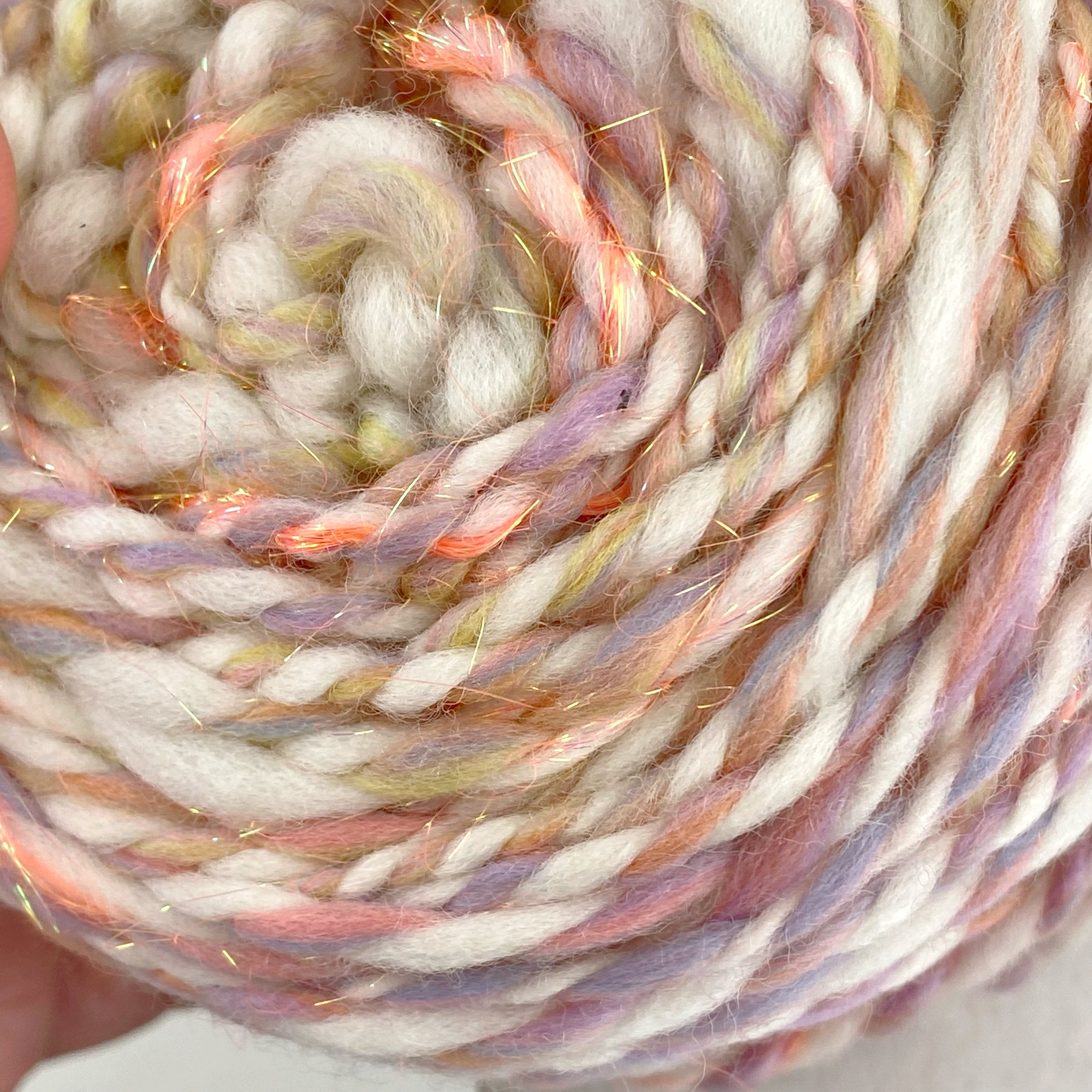 102g of insanely gorgeous and totally unique 'Thick & Thin' hand spun Art Yarn : spun 50% from our 'Ethereal Ether' House Blend and 50% from White Merino Wool Tops plus Angelina on an Ashford E-Spinner. This hand spun yarn features luxuriously soft Merino Wools reared from the backs of happy sustainably raised sheep, plus a little Angelina glitter fibre here and there! :-) xx