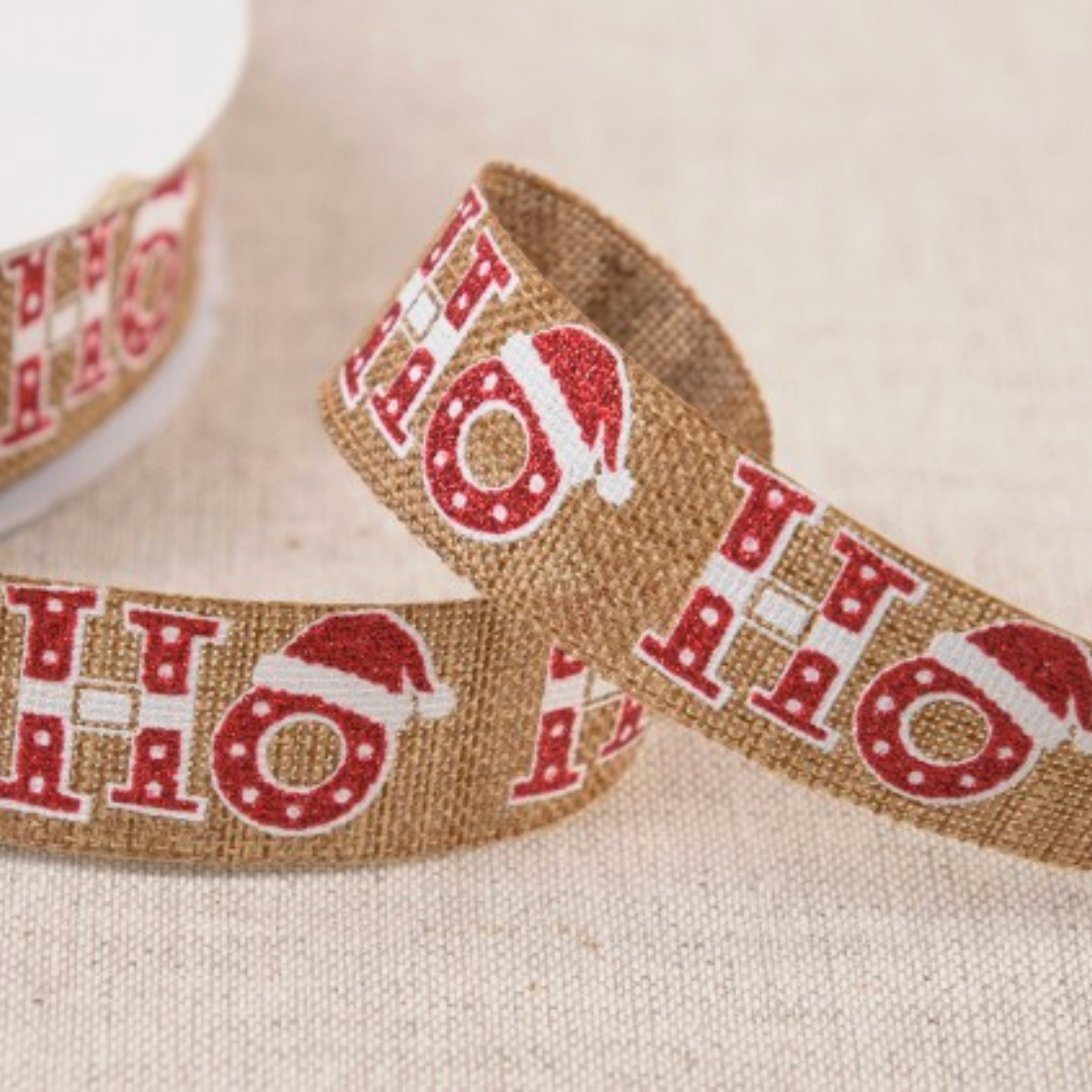 Christmas Ribbon : Ho Ho Ho on a lovely hessian look background.