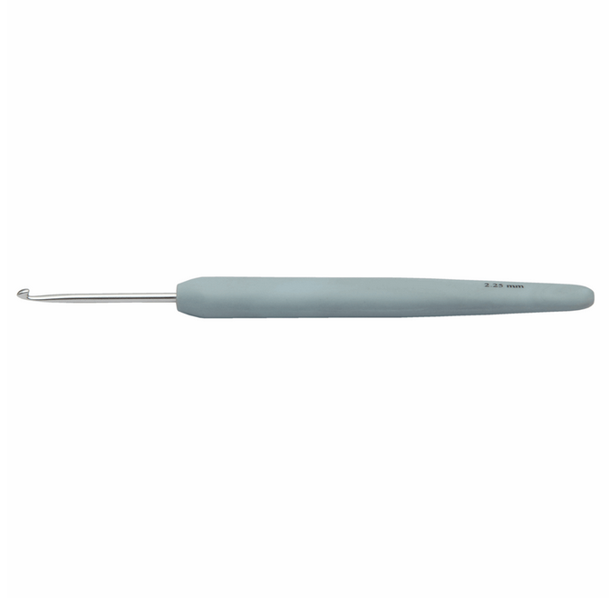 This crochet hook is made from smooth aluminium with a colourful soft grip handle, unique to size. Length: 15cm.