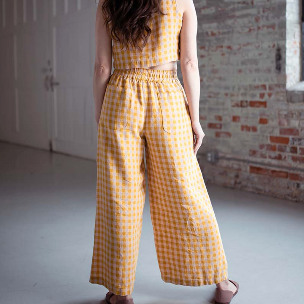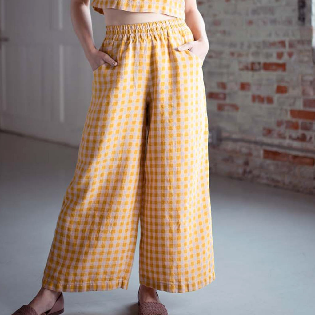 The drape or hand of the fabric will impact the look of the final garment. Softer fabrics will fall more gently, and more stable fabrics will emphasise the leg shaping. Some wonderful choices are chambray, viscose-linen slub, sand-washed linen or cotton, ikat, Brussels washer linen, light twill (like Ventana twill), or cotton-linen blend. Recommended fabrics range in weight from 4.8 oz to 7.9 oz (155 – 268 GSM).