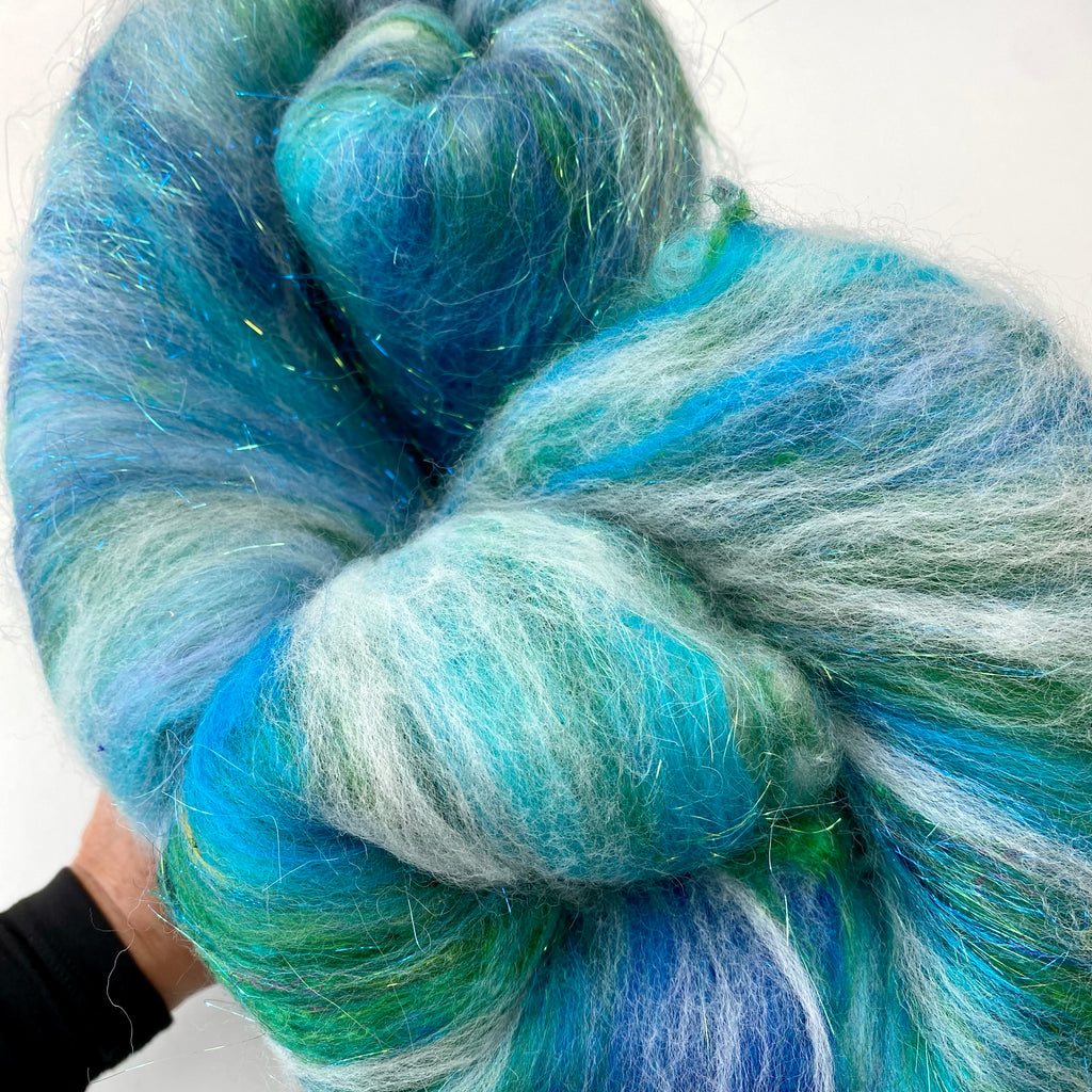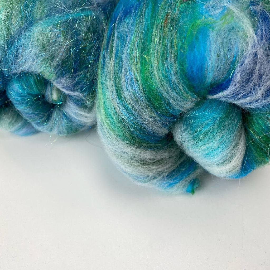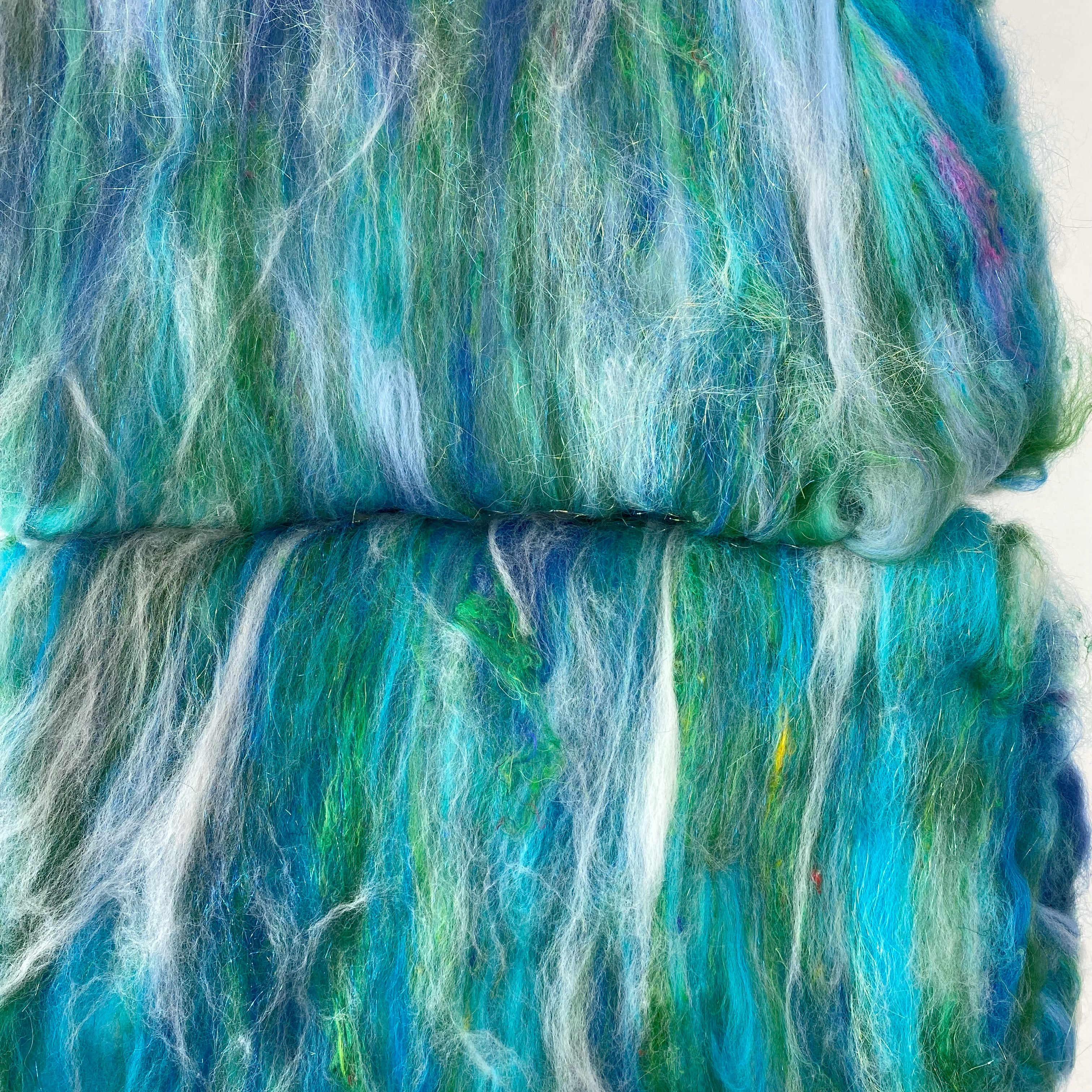 Inspired by the sea this is a 'one off' unique hand carded Batt, made by us at The Gilliangladrag Fluff-a-torium.