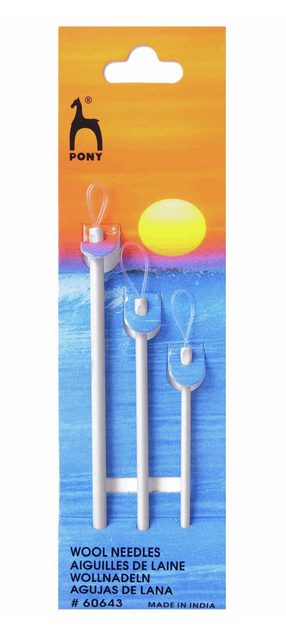 Set of 3 different sized Wool Needle by Pony with acrylic loop instead of eye to make them easy to thread. Great for chunky wool.