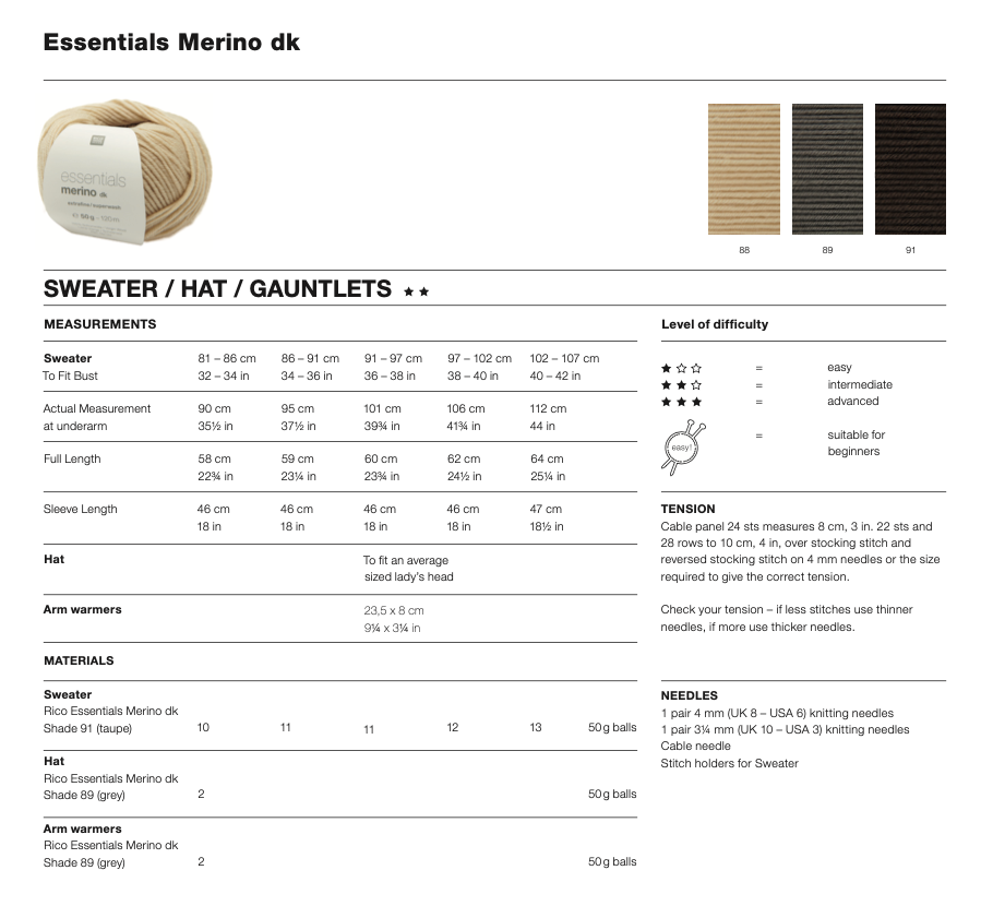 A lovely womens jumper, hat and fingerless gloves pattern using Rico essentials merino DK, which comes in lots of colours!
