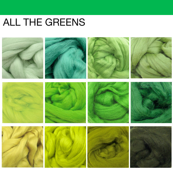 This wooltops bundle contains 100g of each of all of our green wool tops (1.2kg) - there are 12 of them (from left to right, top to bottom:)