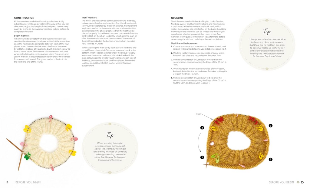 This collection includes 12 top down sweater designs. Each design has an alternative colourway so you can see how it might look in a different palette and experiment with your own colour choices.
