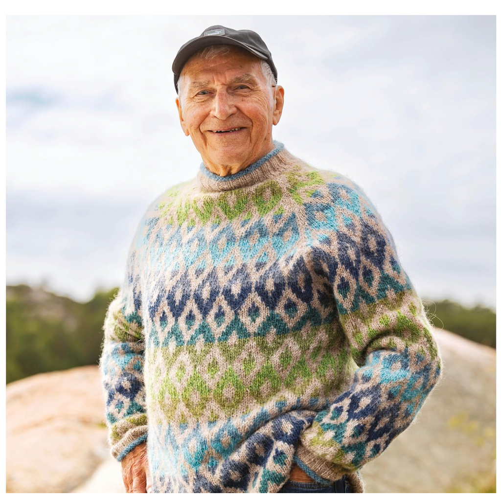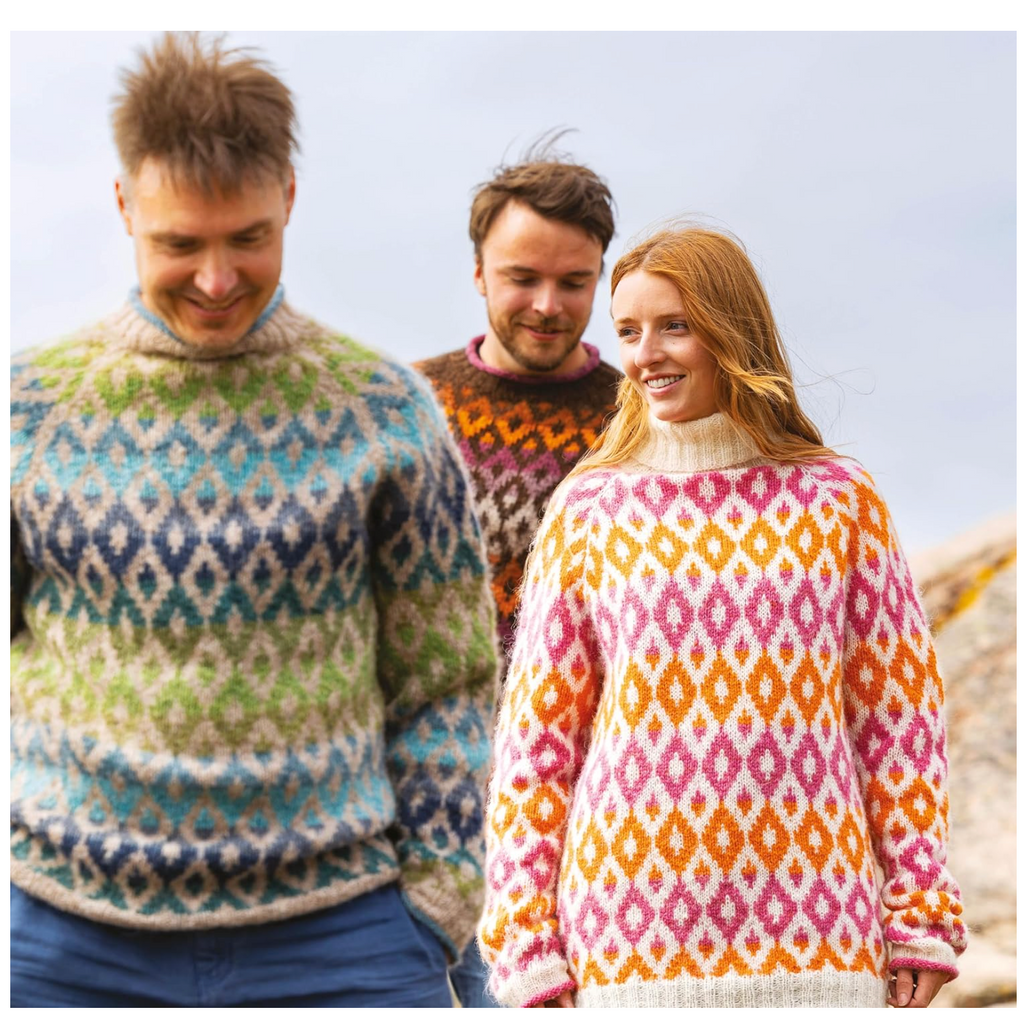Marita uses unspun but not undyed yarn from Norway, Sweden and Iceland to get the same beautiful halo effect, and the same lightness and warmth you get with a traditional lopapeysa sweater.